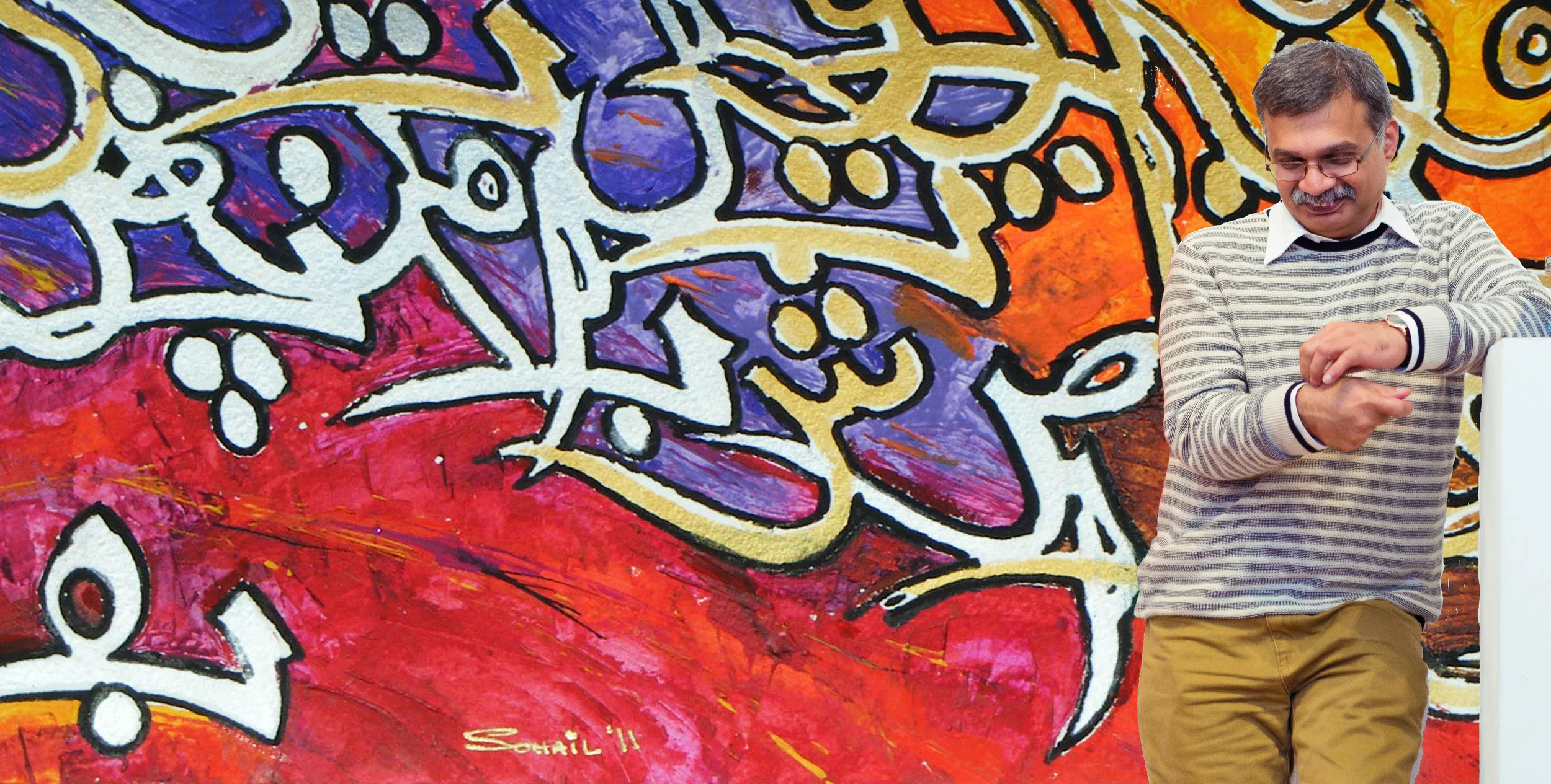 I have a broad palette and I use interaction of colors with the traditional elements, shapes and forms of the alphabet to convey the title of the painting in a manner that it is more receptive to the viewer who may lack the understanding of the foreign script .